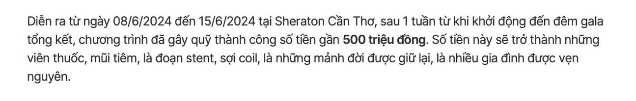 Diễn ra từ ngày 08/6/2024 đến 15/6/2024 tại Sheraton Cần Thơ, sau 1 tuần từ khi khởi động đến đêm gala tổng kết, chương trình đã gây quỹ thành công gần 500 triệu đồng. Số tiền này sẽ trở thành những viên thuốc, mũi tiêm, là đoạn stent, sợi coil, là những mảnh đời được giữ lại, là nhiều gia đình được vẹn nguyên.